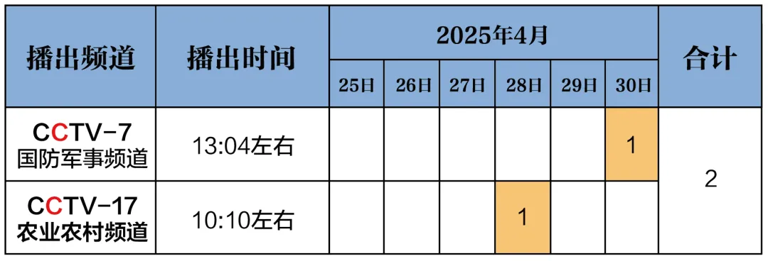 央視播出時間:2025年4月28日,上午10點在CCTV-17套播出,2025年4月30日,下午13:04分在CCTV-7套播出,敬請準(zhǔn)時收看!